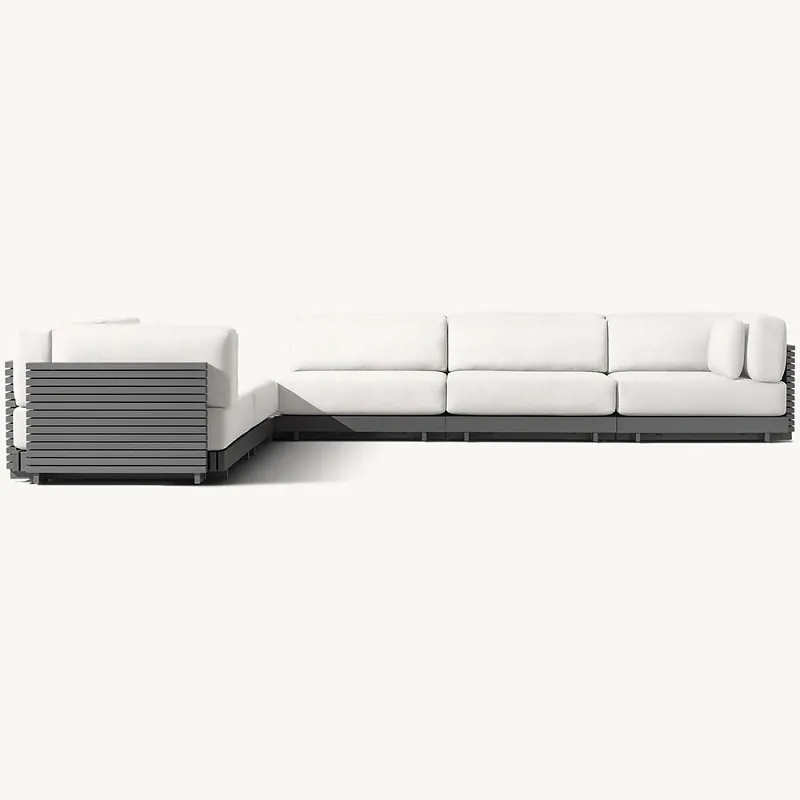 Nosso sofá L para pátio externo é construído em alumínio de alta qualidade, garantindo durabilidade e resistência aos elementos. Conhecido por suas propriedades leves, porém fortes, o alumínio é ideal para móveis de exterior, pois não enferruja, corrói ou mancha. Isso torna o sofá adequado para diversão o ano todo, independentemente das condições climáticas. A estrutura de alumínio também é revestida com pó para proteção extra e um acabamento elegante, aprimorando a estética geral da configuração do seu pátio.