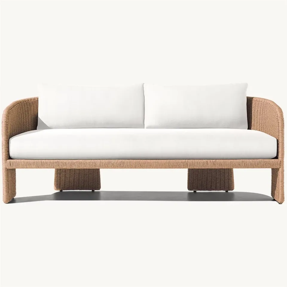 O design envolvente faz com que as pessoas se sintam seguras e aquecidas, como se estivessem envoltas em um abraço suave. A almofada do assento superior é macia e confortável, dando a você um toque de nuvem. A camada inferior é feita de rattan trançado à mão para garantir leveza e ventilação, mantendo você fresco mesmo no verão quente. Este processo de tecelagem não só aumenta a beleza do sofá, mas também traz ventilação e respirabilidade únicas.